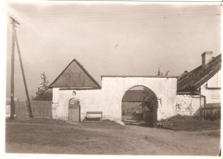 ...Dvůr byl uzavřen podvojnou zděnou branou s velkou branou pro povoz a s menší brankou pro pěší, nad níž je nika pro sochu světce. Na dobových fotografiích vidíme před bránou nezbytnou lavičku.