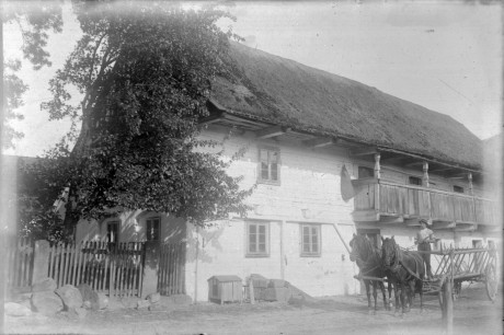 ...20.léta 20.st. Patrová obytná budova omítnutá ve štít.straně a obílená. Konstrukce patra byla podpořena vazbou na tzv. kobylu. Lomenice ve štítu domu byla jednoduchá, tvořená svislým deštěním s jednou profilovanou obloučkovou římsou a kruh.průduchem...